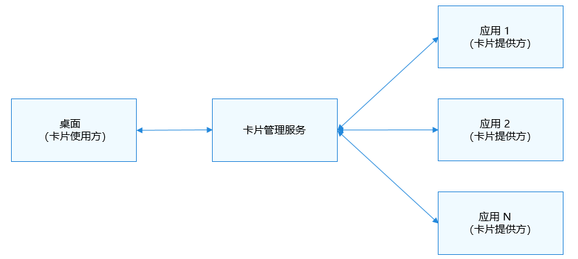 - 卡片使用方:如上图中的桌面,作为显示卡片内容的宿主应用,用于与用户直接进行交互,完成卡片添加、删除、显示功能,并能控制卡片在宿主中具体展示的位置。