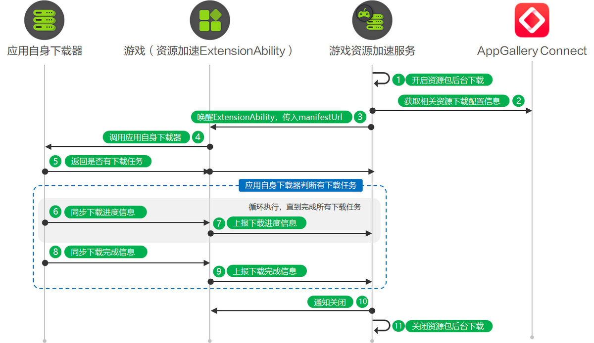 - 应用自身下载器查询是否有下载任务,若有下载任务,则异步下载资源并返回结果true给游戏资源加速服务。若没有下载任务,则返回结果false给游戏资源加速服务,游戏资源加速服务将关闭资源包后台下载。