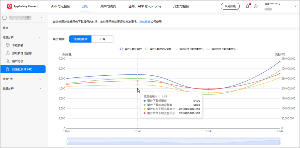 选择“分发分析 > 资源包后台下载分析”,在页面右侧切换“资源包版本”和“日期”为展示依据查看资源包下载数据。