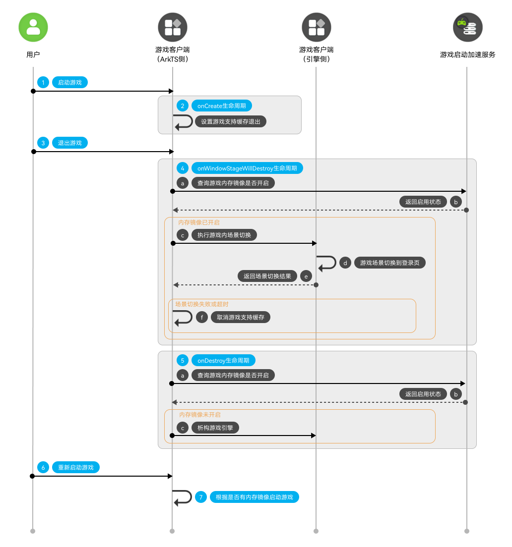 在onWindowStageWillDestroy生命周期中,游戏调用isLaunchMirrorEnabled接口向游戏启动加速服务查询游戏内存镜像功能是否开启。若已开启,ArkTS侧通知游戏引擎将当前场景切换至登录页,引擎完成场景切换后将结果回传ArkTS侧。若场景切换失败或超时,则调用setSupportedProcessCache接口,取消游戏对缓存后快速启动的支持。