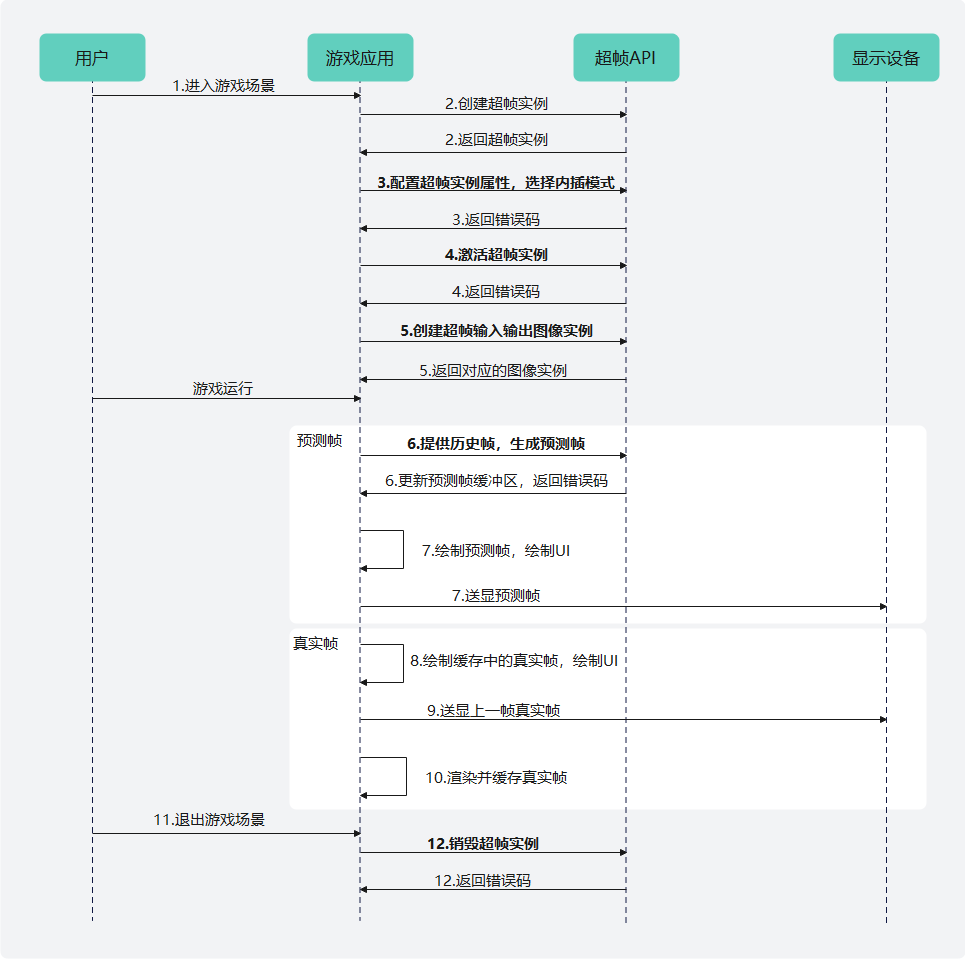 - 游戏应用调用接口配置超帧实例属性。包括调用HMS_FG_SetAlgorithmMode_VK(必选)设置超帧算法模式并选择内插模式;调用HMS_FG_SetResolution_VK(必选)设置超帧输入输出图像分辨率;调用HMS_FG_SetCvvZSemantic_VK(可选)设置齐次裁剪空间Z/W范围及深度测试函数;调用HMS_FG_SetImageFormat_VK(可选)设置超帧输入输出图像格式;如果颜色缓冲区相对深度模板缓冲区基于y轴翻转180度,则调用HMS_FG_SetDepthStencilYDirectionInverted_VK(可选)设置翻转状态。