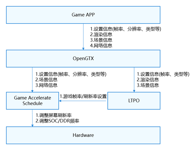 OpenGTX是GPU Turbo X的开放式入口,根据游戏开发者主动提供的游戏过程中的关键信息,使能LTPO(动态帧率/刷新率)等游戏加速方案,助力游戏开发者打造高画质、高流畅、低功耗极致体验。LTPO通过动态感知游戏渲染状态、游戏场景、设备状态等关键信息,动态调整游戏的帧率/刷新率以及设备的SOC/DDR频率。