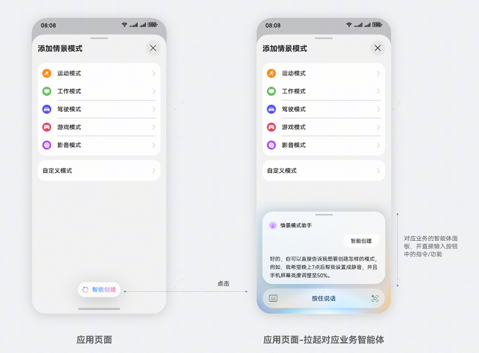 @State isAgentSupport: boolean = false;aboutToAppear() {this.checkAgentSupport()}async checkAgentSupport() {try {let context = this.getUIContext()?.getHostContext() as common.UIAbilityContext;this.isAgentSupport = await this.controller.isAgentSupport(context, this.agentId)} catch (err) {hilog.error(0x0001, 'AgentExample', `err code: ${err.code}, message: ${err.message}`)}}build() {Column() {if (this.isAgentSupport) {FunctionComponent({agentId: this.agentId,onError: (err: BusinessError) => {hilog.error(0x0001, 'AgentExample', `err: ${JSON.stringify(err)}, message: ${err.message}`)},options: {title: '智能创建',queryText: '创建一个新的模式'}})}}} -