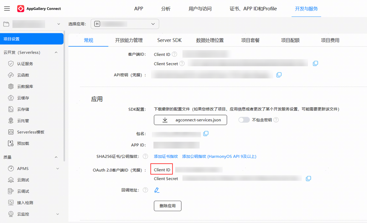 登录AppGallery Connect平台,在“开发与服务”中选择目标应用,获取“项目设置 > 常规 > 应用”的Client ID。