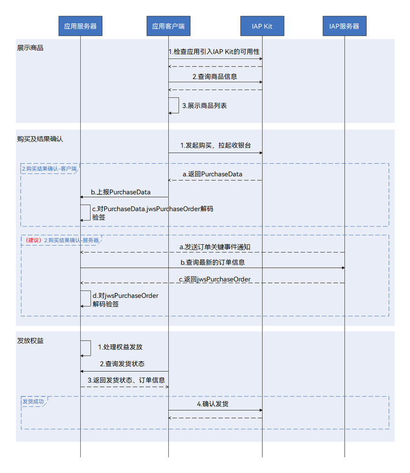 - 为了提高安全性,建议应用服务器接入服务端关键事件通知以接收购买成功结果并通过应用服务器来处理解码验签、完成购买等操作。