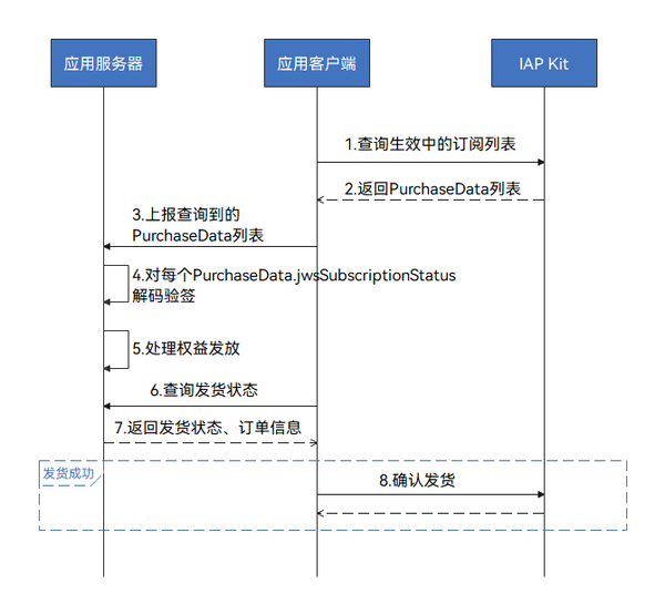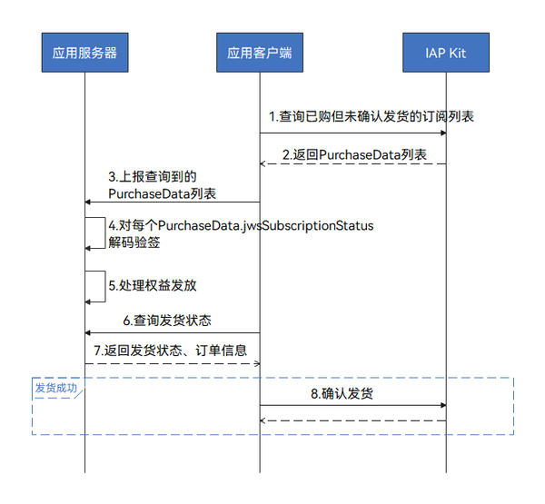 用户购买自动续期订阅成功或者自动续期成功后,开发者需要及时给用户发放相关权益。但实际应用场景中,若出现异常(网络错误等)将导致应用无法知道用户实际是否支付成功,从而无法及时发放权益,即出现掉单情况。