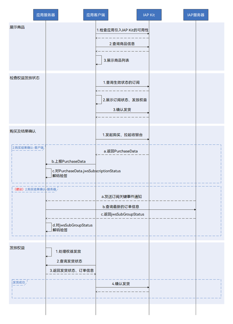 - 为了提高安全性,建议应用服务器接入服务端关键事件通知以接收购买成功结果并通过应用服务器来处理解码验签、完成购买等操作。