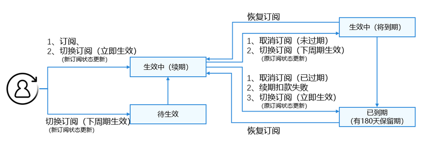 | 待生效 | 否 | 订阅还未开始生效,用户暂时还无法享受该自动续期订阅商品的服务(该状态订阅不支持查询)。 当用户在订阅组内进行切换订阅时,如果切换到一个下周期生效的订阅,则原订阅会变为将到期状态,而新切换的商品为待生效状态。用户可在原商品的订阅详情页内查看新切换商品的开始时间。 |