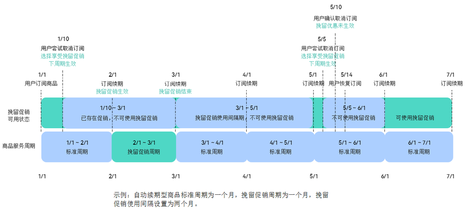 - 用户使用了挽留促销,在续期前取消订阅,则挽留促销未生效。若该场景下用户恢复订阅,当前订阅周期内无法再次使用挽留促销,需完成续期后才可使用挽留促销。