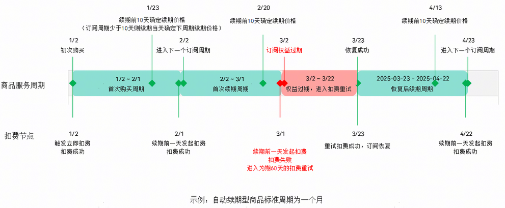 | 尝试扣费 | 否 | 订阅快要到期或到期一段时间内系统会自动按一定周期尝试扣费续期。 |