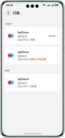 | 取消订阅 | 对已购自动续期订阅商品进行取消操作。取消成功,则订阅将不会进行下一周期的续费,但不影响当期订阅的使用。 说明: 此场景下开发者服务器会收到AUTO_RENEW_DISABLED的服务端关键事件通知。 |
