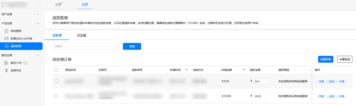 在“运营”页签下,点击“产品运营 > 退款管理”,查看用户提交的退款申请,处理退款订单。