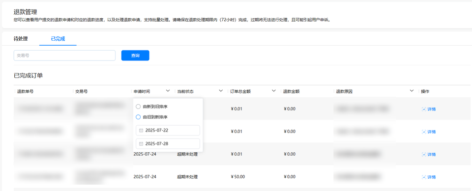查询退款订单:点击“已完成”页签,开发者可以查看所有已处理的退款订单。