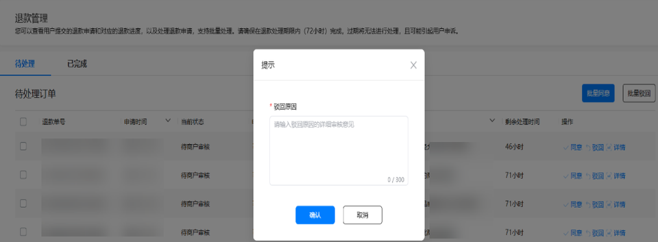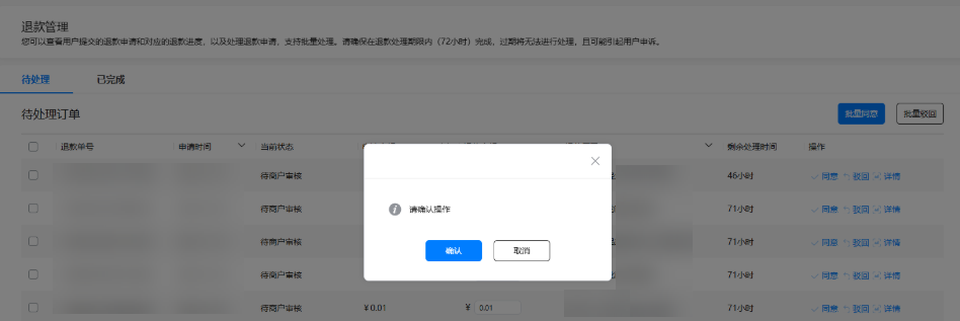 同意退款:如果开发者同意退款,可在 “退款金额“下输入可退款金额,点击“同意”。在弹窗中点击“确认”,即可完成退款。