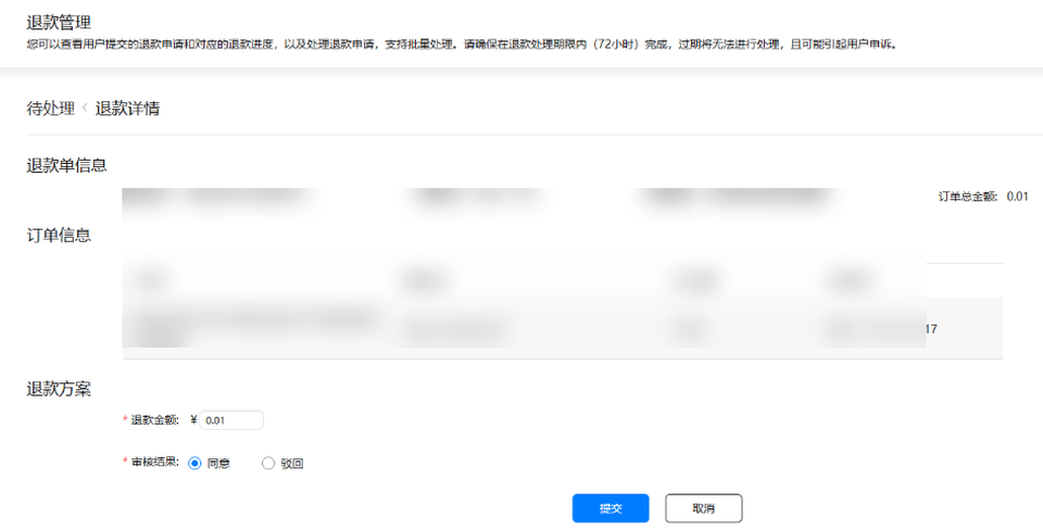 退款详情页面审核退款:开发者也可以在退款详情页面审核退款,输入退款金额后选择“同意”或“驳回”,点击提交,完成审核。
