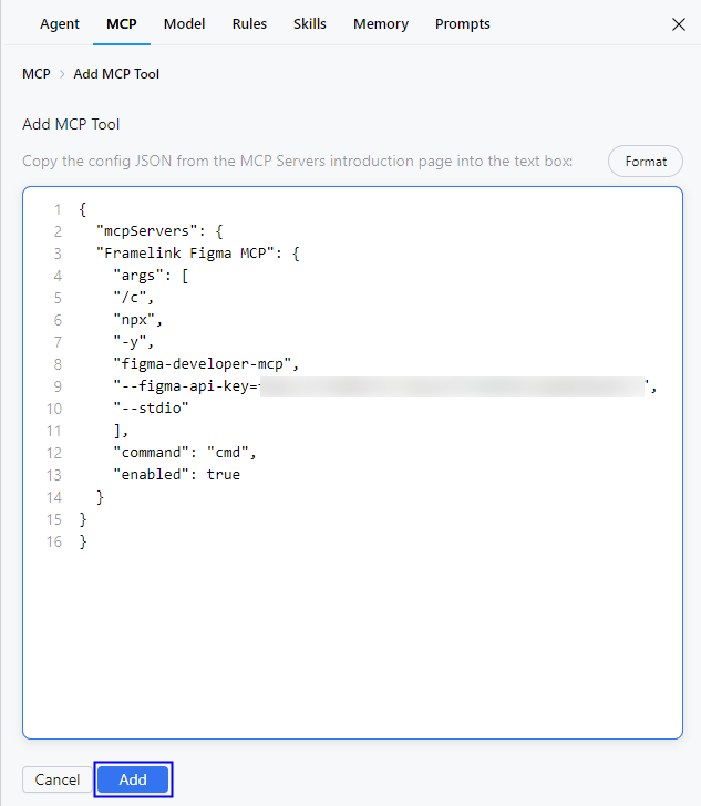 手动添加:在编辑框中填写MCP工具的配置信息,填写完成后点击Add。