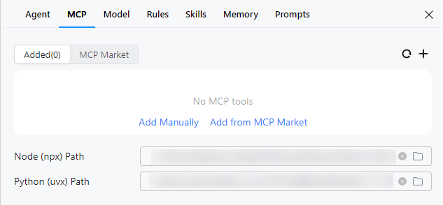 为保证MCP Server正常启动,需要安装npx和uvx,可在配置MCP工具时在Node (npx) Path和Python (uvx) Path中添加。
