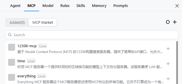 从MCP市场添加:在搜索框中搜索目标MCP工具,点击