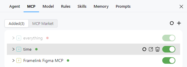 在MCP Tools列表中,展示所有MCP工具信息,包括名称、连接状态、启用状态。同时,将鼠标悬浮在工具上会显示三个操作按钮:刷新、编辑和删除,方便开发者管理工具。
