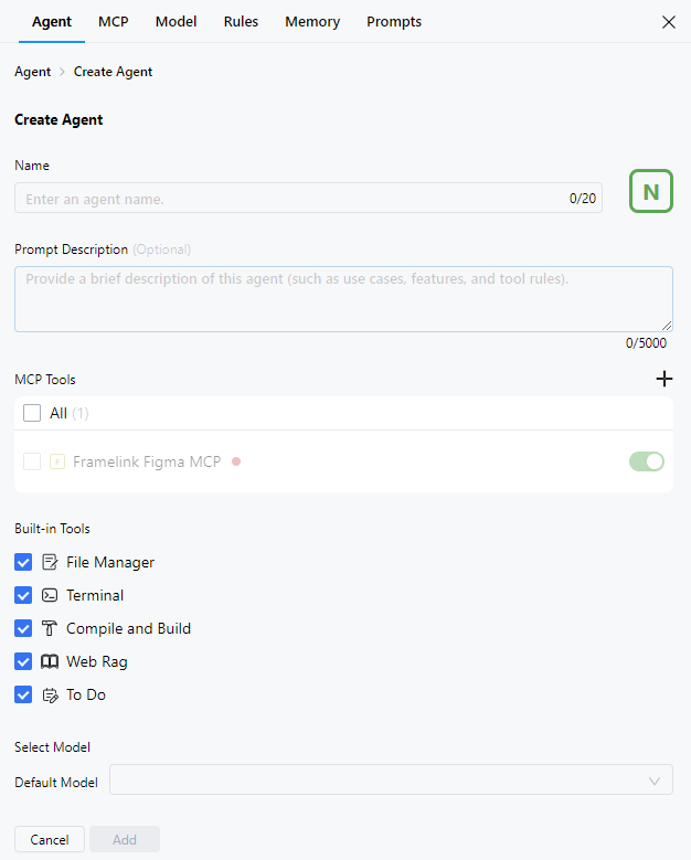 - Built-in Tools:可选,开启或关闭File Manager、Terminal、Compile and Build、Web Rag、To Do,默认开启。。