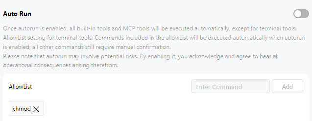 - AllowList:白名单列表,开启Auto Run后,白名单中的命令同样会自动执行。点击Enter Command中输入命令,点击Add可将命令添加至白名单列表;点击命令后×,可将命令从白名单列表中删除。