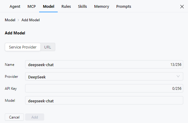 点击置灰的三方模型会跳转到Service Provider配置界面(如deepseek-chat),填写API Key字段即可添加模型。