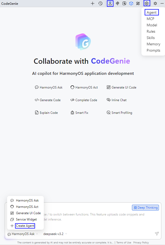 从DevEco Studio 6.0.1 Beta1开始,CodeGenie支持用户添加模型和自定义Agent,增强AI问答能力,提升AI辅助编程和分析能力。