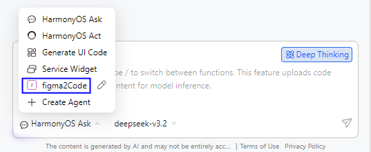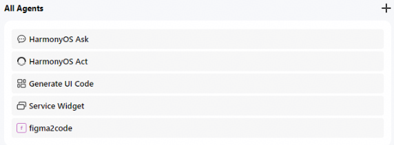 - 在输入框左下角HarmonyOS Ask处下拉框中选择自定义的Agent(如figma2code)。