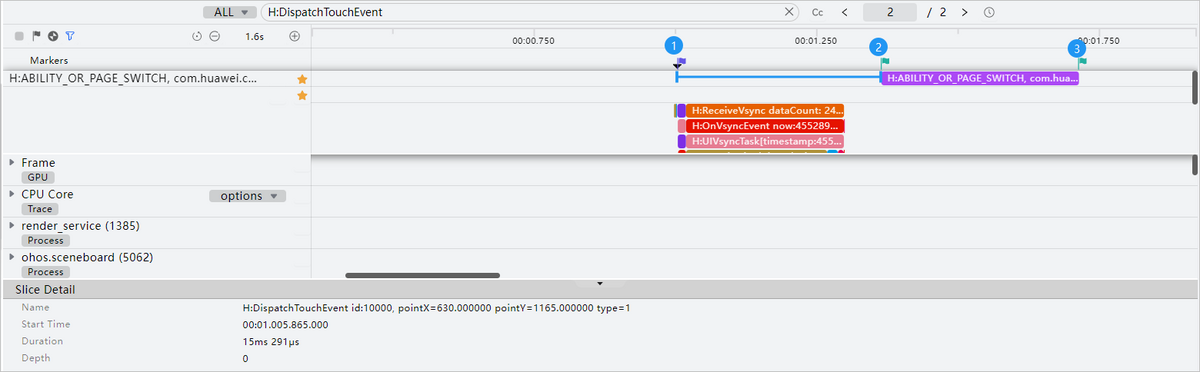 开始时间:点击离手,如图标记1;关键字:H:DispatchTouchEvent,其中type=1。