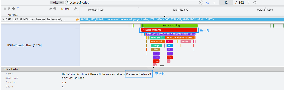 在泳道时序范围内,每一个RenderFrame为一帧,找到这一帧所有的ProcessedNodes字段,提取节点数累加求和(每一帧可能对应多个ProcessedNodes,所以需要累加求和),即每帧渲染的节点数 = Σ ProcessedNodes。