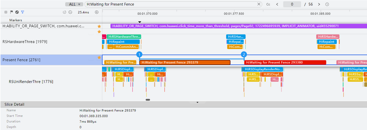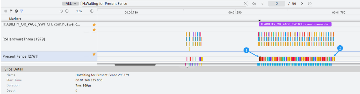 每帧渲染实际耗时(ms):【下一个H:Waiting for Present Fence xxxx的起始时间】 - 【当前H:Waiting for Present Fence xxxx的起始时间】如下图 【标记2 - 标记1】。