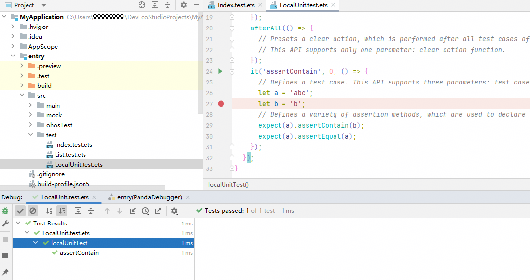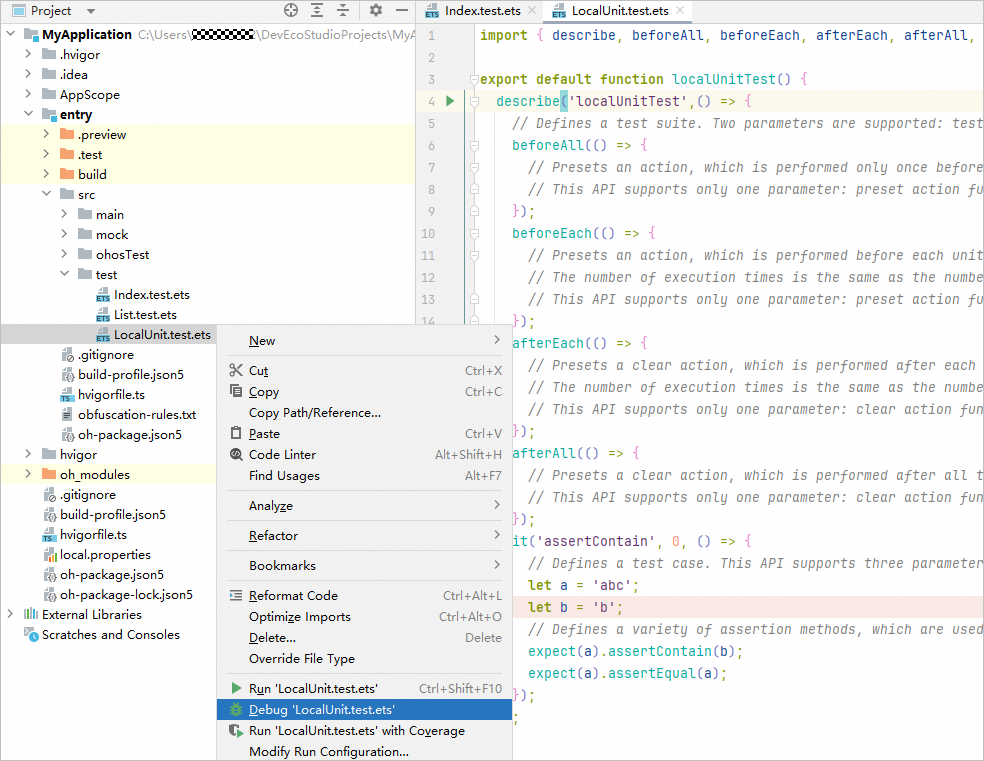 可以采用运行工程目录(test)、测试文件(如Index.test.ets)、测试套件(describe)、测试方法(it)的方式来执行Local Test,各级别测试执行入口如下。