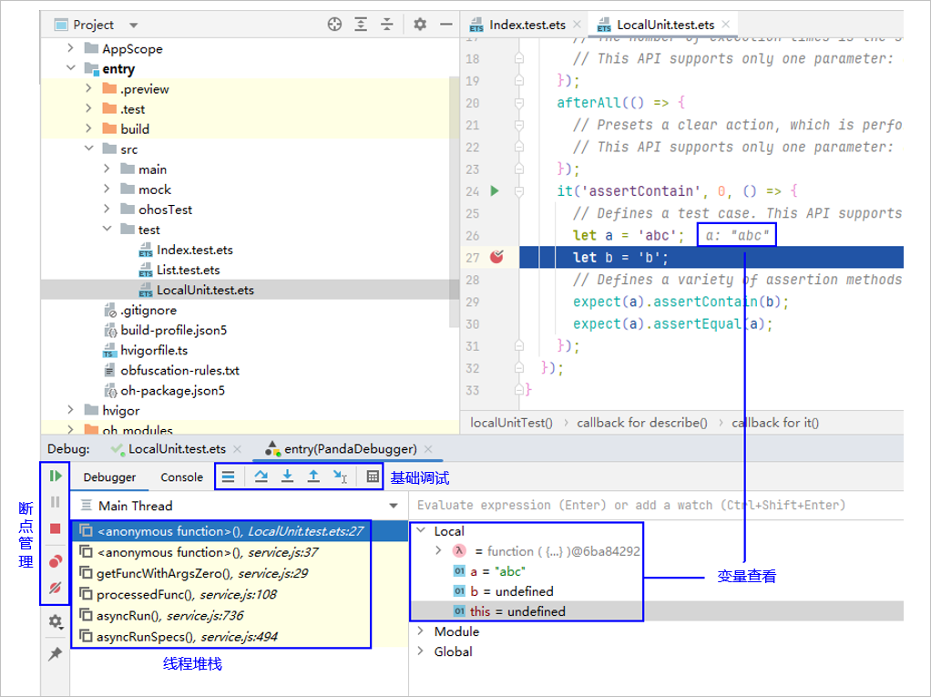 在断点命中时,下方将出现Debug窗口。开发者可在该窗口中进行断点管理与基础调试能力的可视化操作,在断点命中时可查看当前线程的变量和堆栈信息。