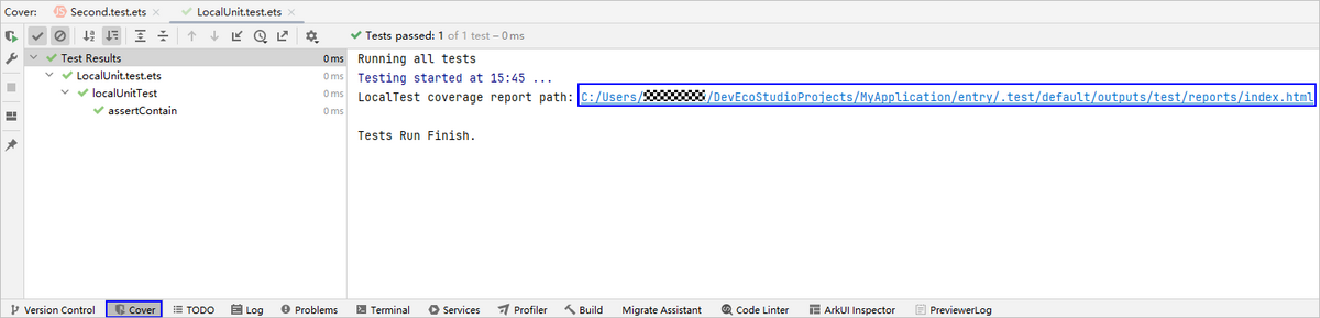 启动测试后,进行编译构建,底部将出现Cover窗口,构建结束后自动拉起Cover窗口,测试任务结束后,窗口中会打印测试报告的路径。