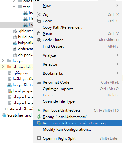 在LocalTest运行的基础上支持代码覆盖率统计,当前仅支持ArkTS工程。