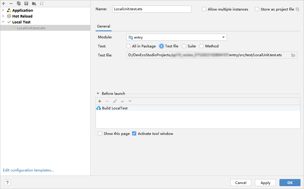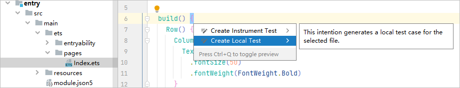 在工程目录下打开待测试模块(支持HAP、HAR、HSP模块)下的ets文件,将光标置于代码中任意位置,单击右键 > Show Context Actions > Create Local Test或快捷键Alt+Enter********(macOS为Option+Enter) > Create Local Test创建测试类。