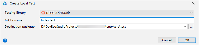 - ArkTS name:创建的测试文件名称,测试文件中包含了测试用例。测试文件名称要求在工程目录范围内具有唯一性,仅支持字母、数字、下划线(_)和点(.)。