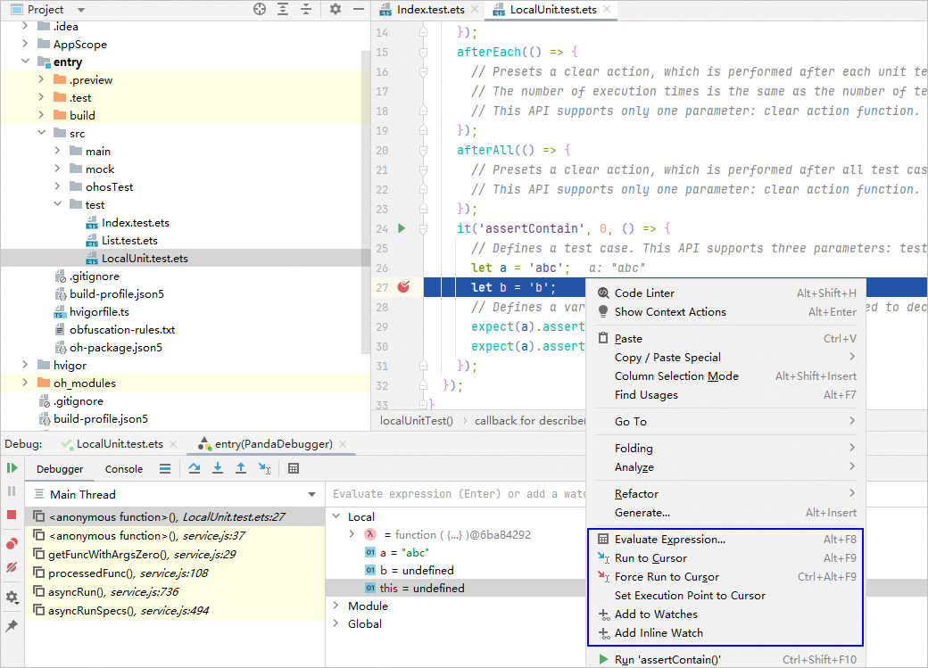 以文件级别为例,在添加断点之后,在工程目录中,选中文件,单击右键 > Debug'测试文件名称',以调试模式执行测试任务。
