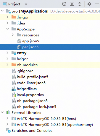 开发App情况下,选中AppScope目录新建pac.json5文件。