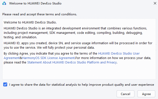 DevEco Studio在首次启动时,弹窗出现提示开启数据采集功能。该功能用于帮助DevEco Studio改进使用体验,收集的数据将按照关于HUAWEI DevEco Studio 平台与隐私的声明处理。