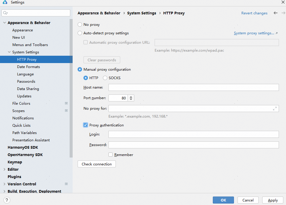 在欢迎页单击Customize > All settings… > Appearance & Behavior > System Settings > HTTP Proxy进入HTTP Proxy设置界面。如果已经打开了工程,可以单击File > Settings(macOS为DevEco Studio > Preferences/Settings) > Appearance & Behavior > System Settings > HTTP Proxy进入HTTP Proxy设置界面。