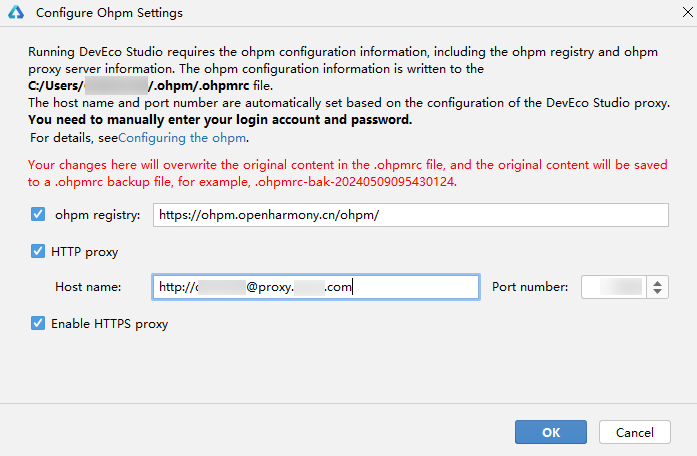 在此界面配置的代理信息将写入“users/用户名/.ohpm”目录下的****.ohpmrc文件。因此也可直接修改“users/用户名/.ohpm”目录下的.ohpmrc****文件进行配置。