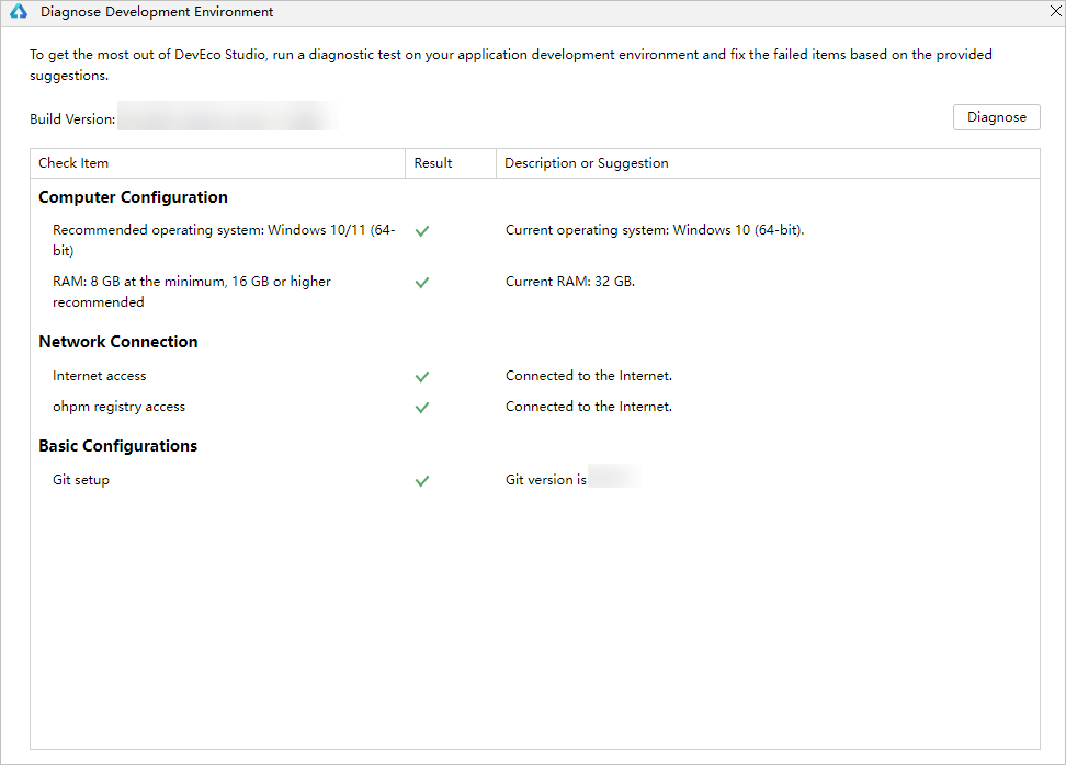 DevEco Studio开发环境诊断项包括电脑的配置、网络的连通情况等。如果检测结果为未通过,请根据检查项的描述和修复建议进行处理。