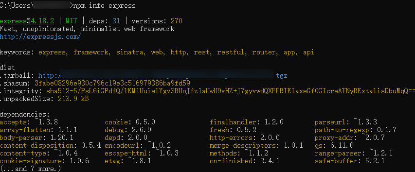 npm info express执行结果如下图所示,则说明代理设置成功。