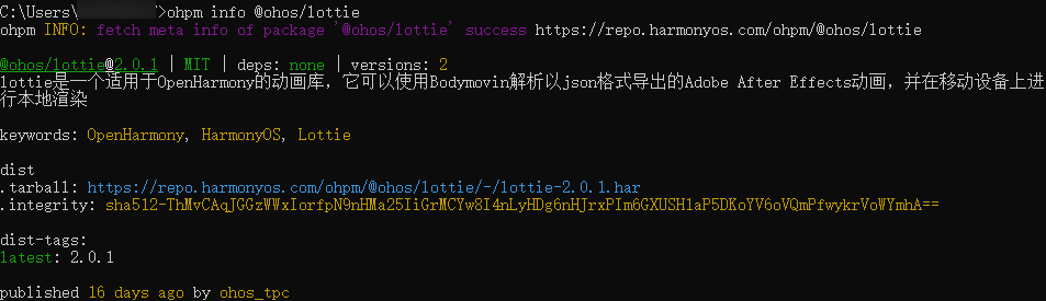 ohpm info @ohos/lottie执行结果如下图所示,则说明代理设置成功。