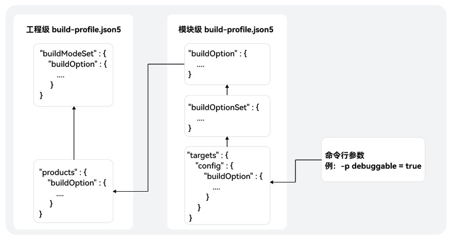 - 工程级build-profile.json5中product的buildOption会对buildMode的buildOption继承覆写,即相同配置项product的优先级更高。