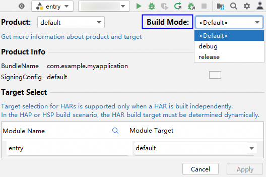 - <Default>:默认选项,选择此项,构建APP包,使用release构建模式;构建HAP/HSP/HAR包,使用debug构建模式。