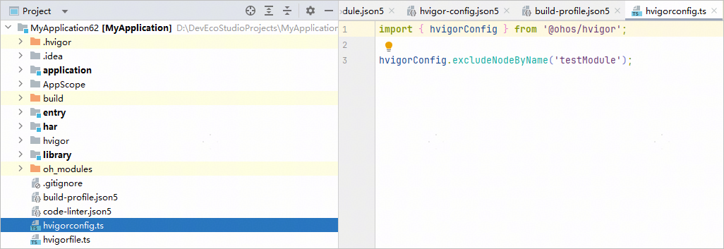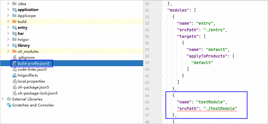在工程级build-profile.json5的module字段下,添加工程中不存在的模块,如testModule。
