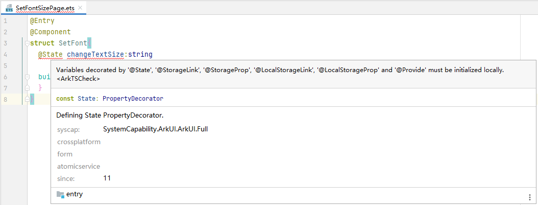 从DevEco Studio 4.0 Release版本开始,当compileSdkVersion≥10时,编辑器代码实时检查支持ArkTS性能语法规范检查。