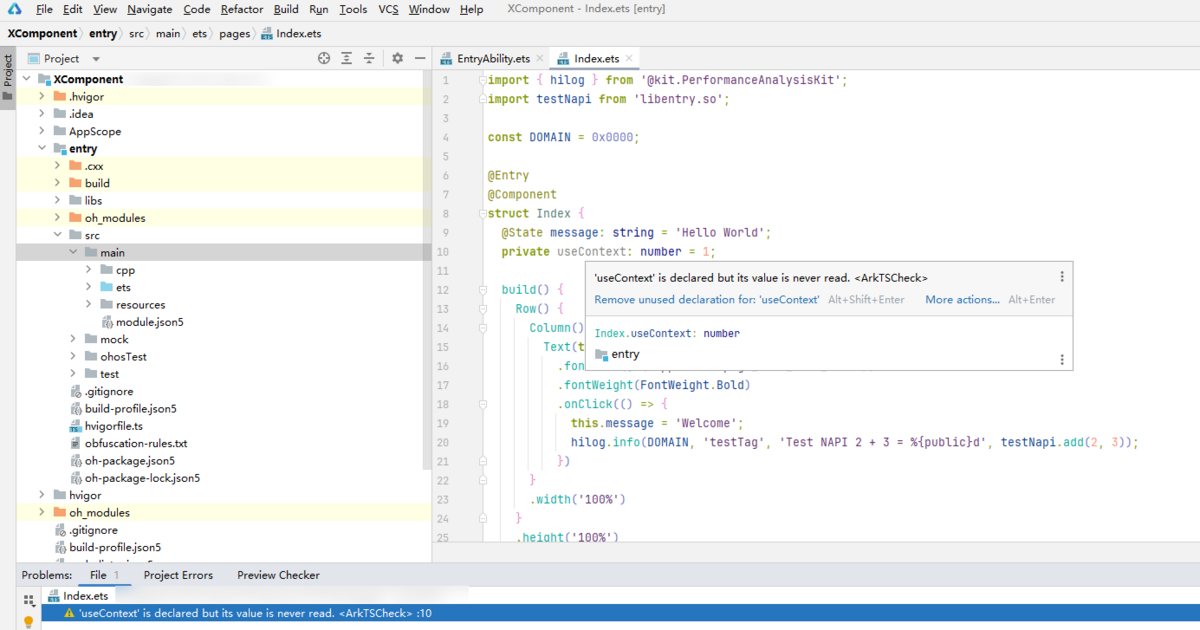DevEco Studio支持代码快速修复能力,辅助开发者快速修复ArkTS或C++代码问题。